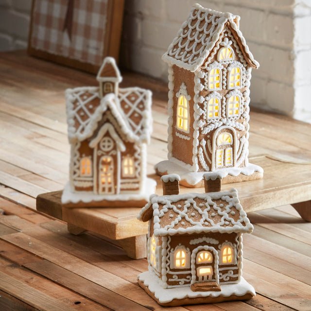 We love sweet gingerbread houses- to bake and to decorate with! These adorable gingerbread houses are made up of light brown cookie textured walls and swirls of white icing trimming the windows, door, and roof! Choose the cozy little cottage house or a fun townhouse! Perfect to decorate your tabletop or mantel this Christmas season. Requires 3 AA Batteries. 6 Hour Timer Repeats Every 18 Hours. Made by Raz Imports. Made of clay dough. Dimensions: 5.5" L X 4.75" W X 6" H. Item #: 4416433