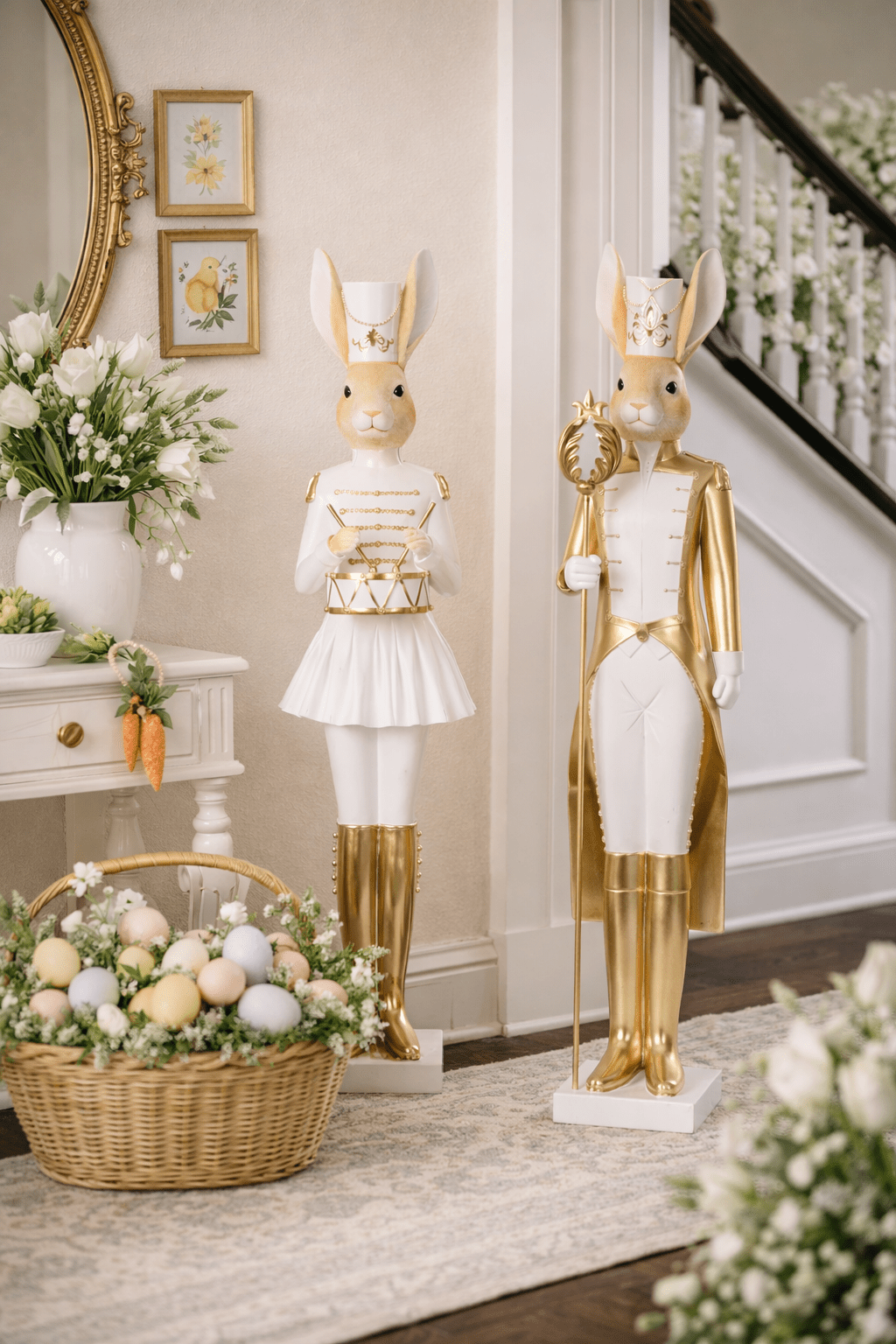 Make a statement this Easter with the elegant Luxe Rabbit Nutcracker with Drum. Finished in a refined palette of soft white and gold, this charming piece features delicate detailing, a classic drum and a top hat that adds a playful yet sophisticated touch. Perfect for styling in entryways, hallways or on a side table, it brings height and character to your seasonal décor. Display on its own or pair with the matching rabbit nutcracker to create a striking Easter display that welcomes guests with timeless charm.