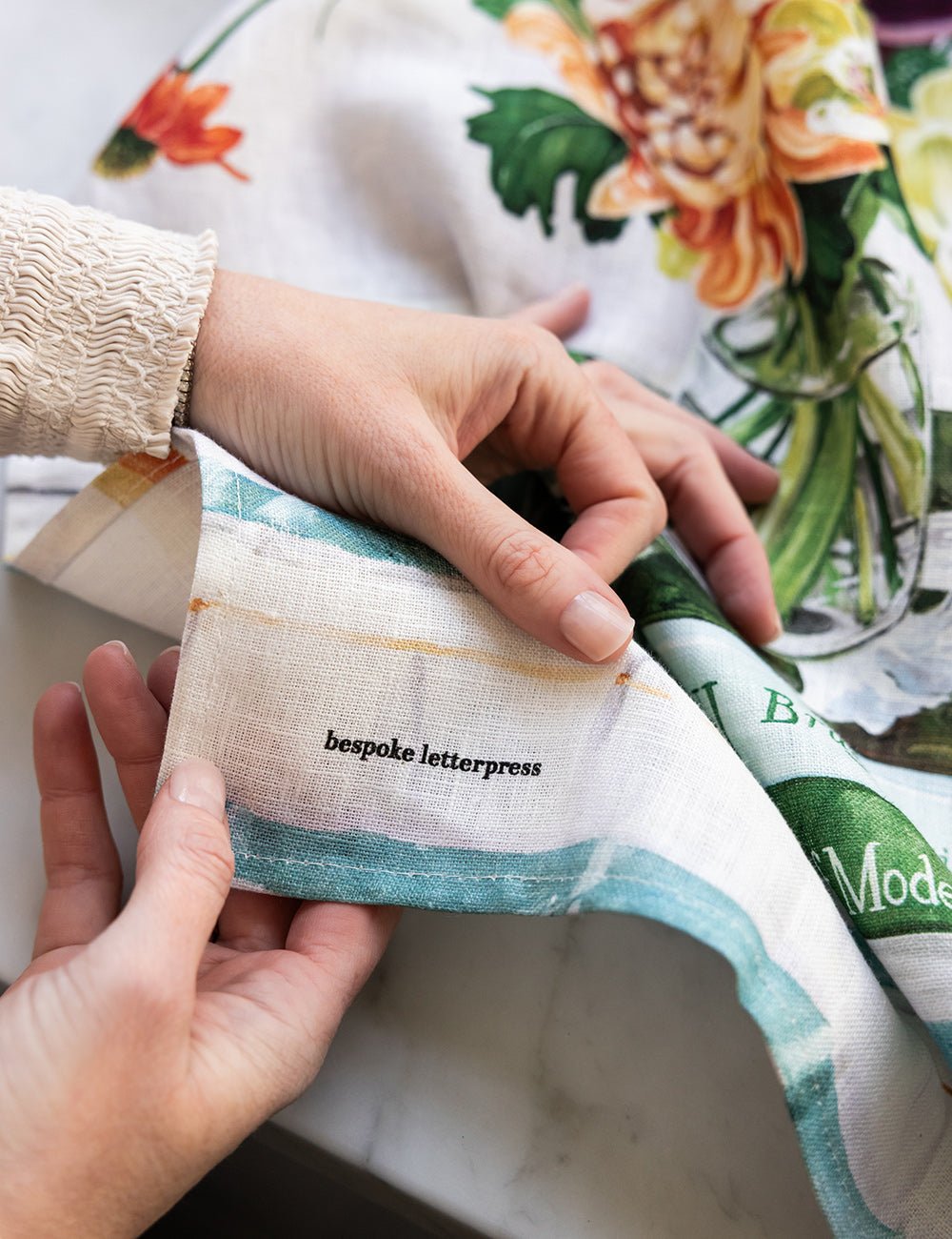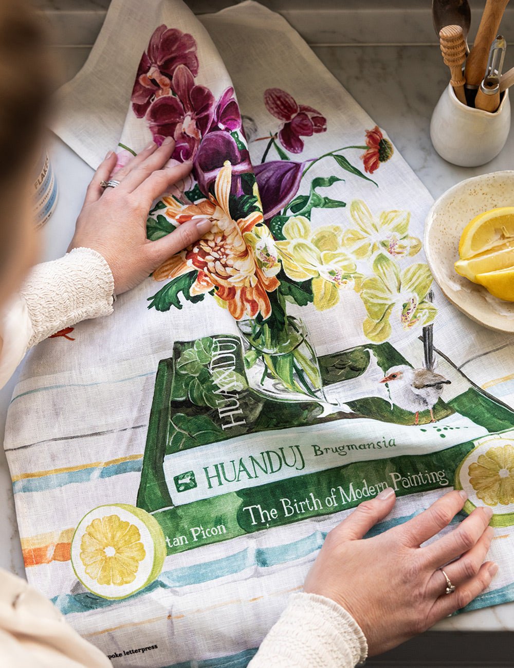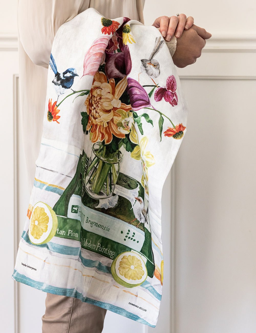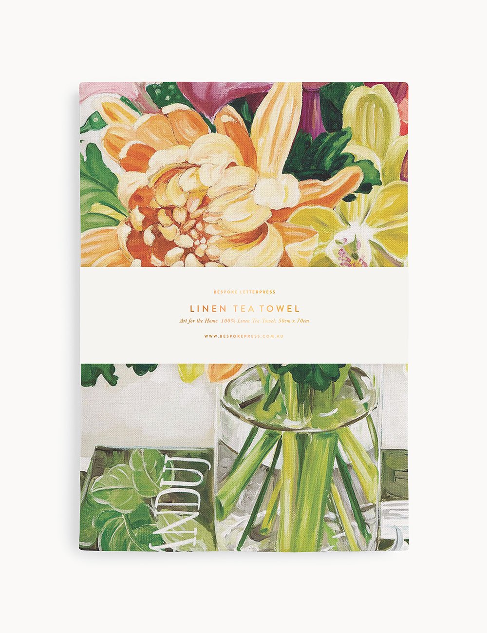 Artwork by Dominika Keller and printed on 100% Linen Tea Towel. Supplied folded with a gold foil printed removable bellyband.
