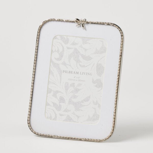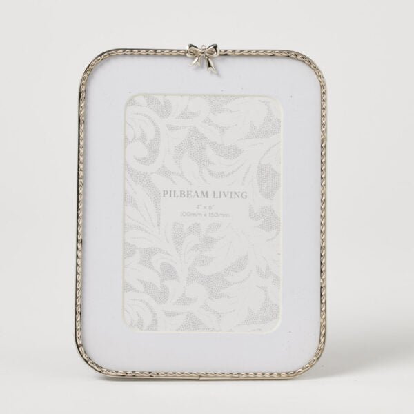 Elevate mantel and shelf displays with the Bella 4 x 6″ Photo Frame, featuring a silver-toned edge and a delicate bow accent for a timeless, feminine finish to treasured photographs.
