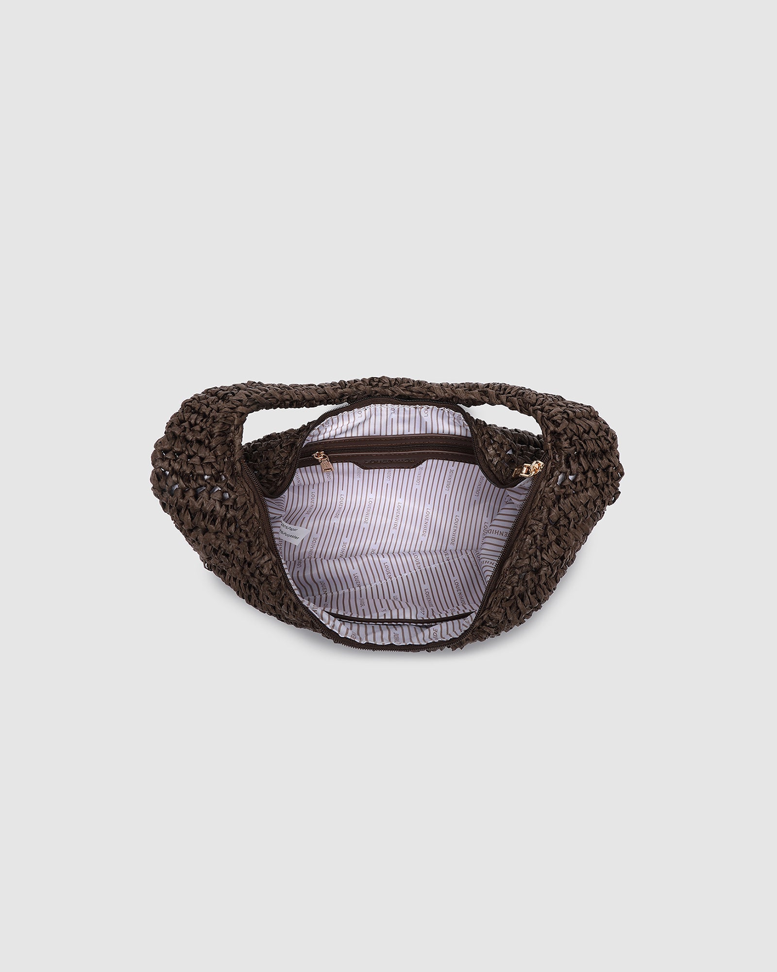 The Nellie Chocolate Raffia Shoulder Bag captures the carefree charm of a coastal summer, blending natural texture with refined design. This lightweight woven handbag is crafted from dark, natural raffia in a softly sculpted crescent silhouette - made for breezy days and golden hour strolls. Light gold hardware adds a polished finish, while a secure zip closure keeps your essentials safe from brunch to beach club. Designed to sit comfortably under the arm, this raffia handbag brings a touch of laid-back luxury to any look. Whether paired with a linen set or a flowing sundress, Nellie Chocolate Raffia is the perfect companion for long lunches, market mornings, and everything in between.